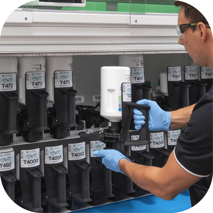 Minimieren Sie den Materialverbrauch und profitieren Sie von einem sauberen und reinen Arbeitsplatz. Das revolutionäre, eigenständige Mischsystem eignet sich für alle Mischräume.